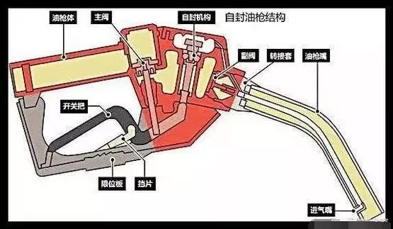 加油過程中,自封室的鋼珠卡主控制桿(開關),汽油頂開油閥出油,油流出油管回流閥的時候帶動空氣流動,由吸氣管經過吸氣嘴吸氣。閥門開啟完畢,加油的時候油位到吸氣孔的時候,迫使空氣從自封室吸入回流閥,在提起自封膜片使鋼珠松開控制桿,斷開加油。